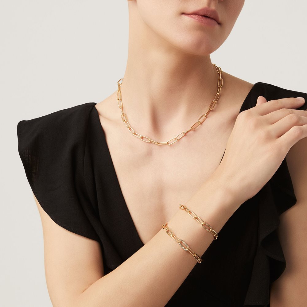 The Happy bracelet features a silver chain with elongated links in a minimalist style. Made from gilded silver, this very light and elegant piece can be worn on the wrist all day long. Beauty in contemporary simplicity.