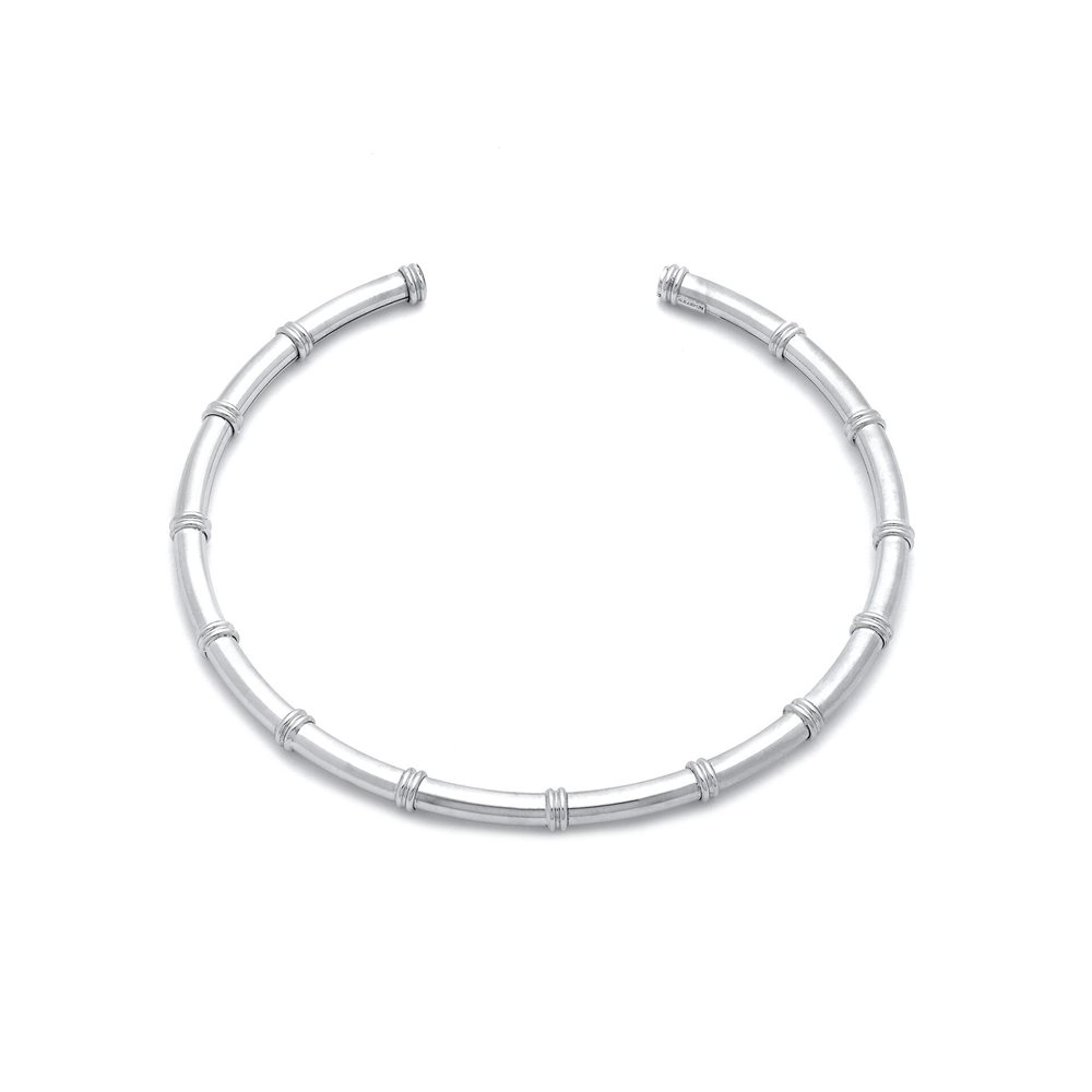 The Jackie necklace was born from Giovanni Raspini's desire to create truly contemporary silver jewellery. The hollow tube workmanship creates linearity and an abundance of light to illuminate the face. It is enriched by pairs of rings turned and soldered on the piece of jewellery with a geometric rhythm. Silver worked by hand in Italy.